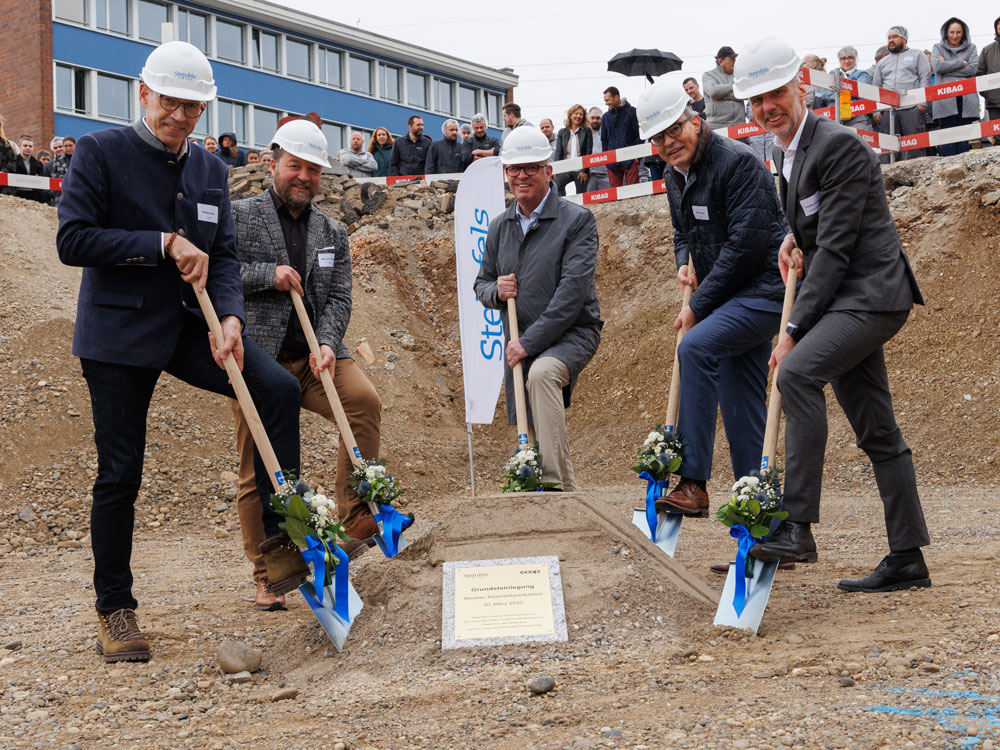 Finalmente ce l'abbiamo fatta: il 30.3 è stata posata la prima pietra del nuovo stabilimento di Steinfels Swiss. Nemmeno la pioggia è riuscita ad offuscare l'allegria degli invitati. Ai collaboratori è stata riservata un'altra piacevole sorpresa: eccellente prosecco e deliziosi elmetti da cantiere Steinfels Swiss realizzati in cioccolato.